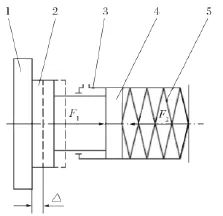 如圖1所示,F1為油壓力,F2為彈簧預壓縮力。顯而易見,盤形制動器是靠油壓力 F1松閘,彈簧預壓縮力 F2制動來實現其功能的。