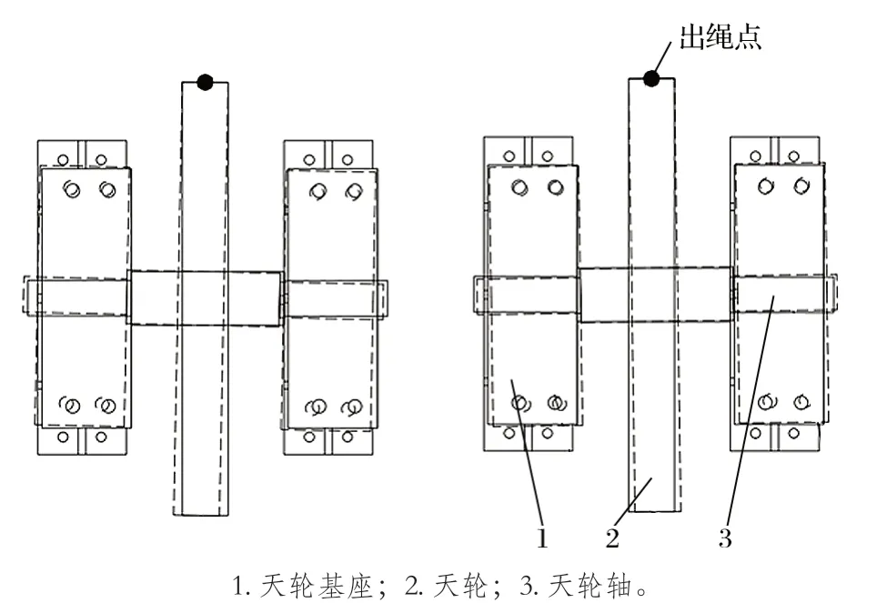調整天輪和鋼絲繩內外偏角的原則,需保證內外偏角值滿足《金屬非金屬礦山安全規程》規定,同時還要確保出繩點位置不改變,即出繩點應維持在罐籠中 心位置的正上方,保證提升容器穩定,如圖 2 所示。θ 為 1 號天輪和基座整體旋轉的角度,以出繩點為原點順時針轉動;B1 和 B2 為調整之前的內外偏角,圖片′為調整之后的內外偏角,2 號天輪和 1號天輪的調整方式一致,僅旋轉方向為逆時針方向。
