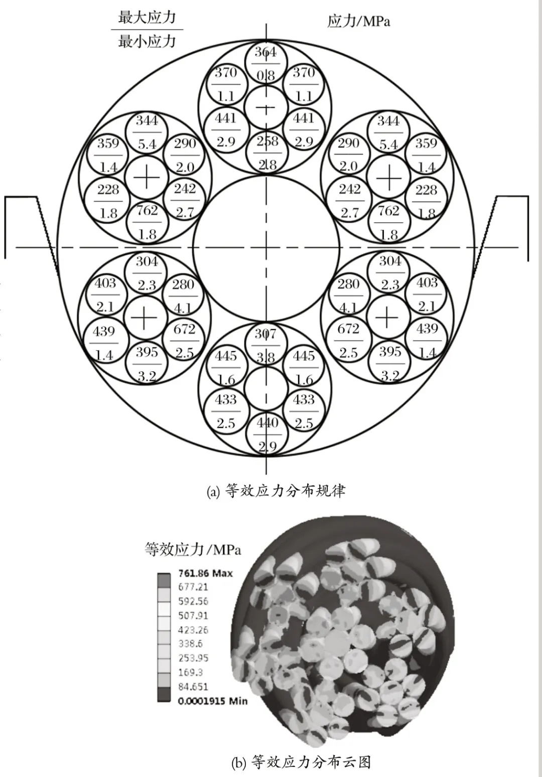 從圖6(a) 可以看出,鋼絲繩在受載作用時,此時的等效應力呈現出不均勻的分布形式,且存在層狀分布;鋼絲繩的應力受到空間位置和相位變化的影響,在繩槽的中 心軸線上下部分分布不均勻;從圖6(b) 可以看到,鋼絲繩截面上應力近似呈現對稱層狀分布,彈性區域和塑性區域相互交叉。鋼絲繩的外股層和接觸位置的應力比其他同股的應力較大,此時zui大值為 761.97 MPa,zui大應力分布在靠近中 心軸軸線上半部分的左右兩側。鋼絲繩的交互捻外層股二次捻制鋼絲繩中,靠近繩芯的位置應力比較大,zui大應力是1 121.78 MPa,分布在繩槽中 心軸線上半部分。通過對比圖4 可以看出,zui大應力主要集中在鋼絲繩的外側,不同繩股層的鋼絲繩應力值不同。
